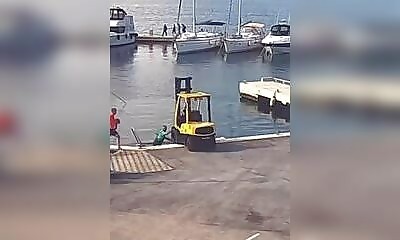 Le menu du jour? Un exploit de cariste, un bateau gonflable et un détour non prévu dans les eaux marines. Le cariste, avec un zèle admirable, tente d'extraire un bateau gonflable de l'océan. Sauf qu'il oublie un détail, ...