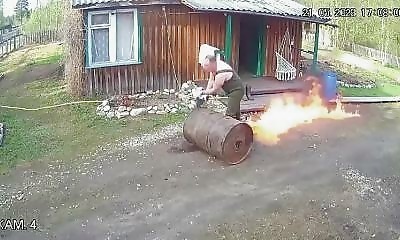 Quand un homme tente de découper un bidon rempli d'un liquide inflammable à la disqueuse. Sa femme avait déjà vu le fail arriver en début de vidéo...