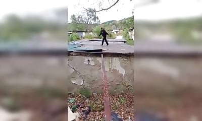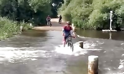 Un cycliste tente de traverser un pont submergé par la crue et apprend une chose: les vélos flottent. L'engin s'échappe et part voguer seul sur l'eau pendant que son propriétaire patauge.