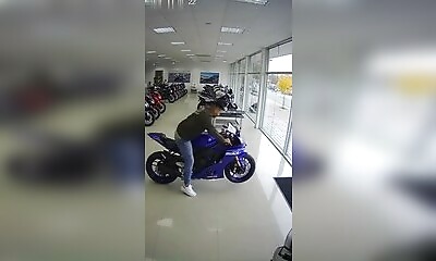 Un homme démarre une Yamaha sportive directement dans le showroom pour entendre le bruit du moteur. Sauf que la moto part d’un coup vers l’avant, il perd le contrôle et traverse la vitre du magasin. La scène est rapide, ...
