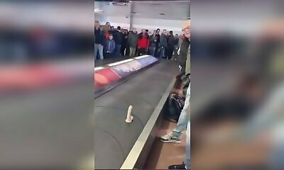 Dans un aéroport, des passagers qui attendent sagement leurs bagages ne peuvent pas cacher leur amusement en découvrant un gode posé sur un tapis roulant à bagages... Cette blague bien salace a dû faire saliver un bon no...