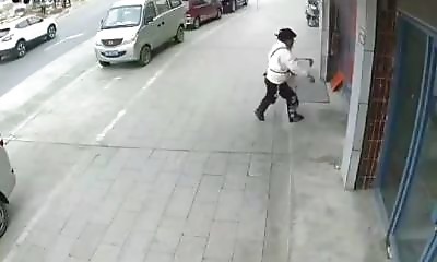 Alors que cet homme se rendait dans sa boutique de piles préférée à Shenmu en Chine, le magasin a littéralement explosé, le faisant s'envoler en arrière. Par chance, l'homme n'a eu que le nez cassé.