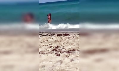 Dans la mer, une femme tente de faire un selfie avec une vague en fond, mais vous verrez, ce n'est pas si facile...