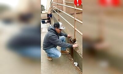 Un homme aperçoit un martin-pêcheur dont les pattes sont collées à une rambarde métallique, certainement à cause du froid, et, avec un peu de patience, réussit à le libérer.