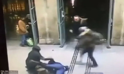Dans ce qui semble être un garage, l'un des employés met en place une barre de fer (peut être pour soutenir la porte ?), sans faire attention à ce qu'elle ne tombe pas sur son collègue... 2 fois.