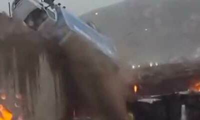 Un camion est tombé vendredi 2 décembre d'une bretelle d'autoroute à Santa Clarita, en Californie, sur deux autres véhicules qui se trouvaient en contre-bas. Les images spectaculaires ont été filmés et montre le camion s...