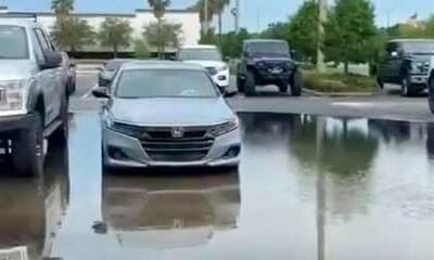 Une femme qui vient de faire l'acquisition d'une nouvelle paire de baskets veux prendre toutes les précautions pour sortir de son véhicule garé sur un Parking en évitant une flaque d’eau. Mais vous allez voir que sa tent...