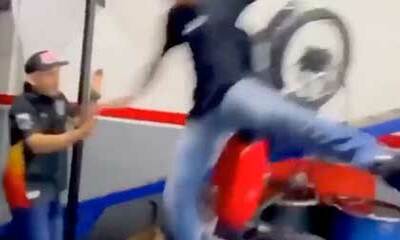 Dans un garage au Brésil, un mécanicien veut faire une cascade pour impressionner ses collègues. Il se lance dans la descente d’une rampe avec une moto mais vient perdre l’équilibre pour venir terminer la tête contre le ...
