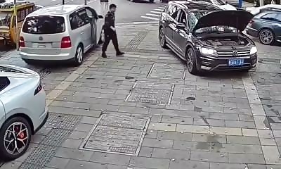 Un mécanicien chinois déplace les voitures de clients devant son garage et visiblement, le frein à main n'est pas dans ses habitudes. La Volkswagen grise repart toute seule en reculant, la Volkswagen noire avance sans lu...