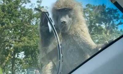 Au Knowsley Safari Park dans le Merseyside en Angleterre, une famille s’est retrouvée avec un singe sur le capot de son véhicule. Ce dernier a joué avec le joint du pare-brise pour commencer par l’arracher sous le rire d...