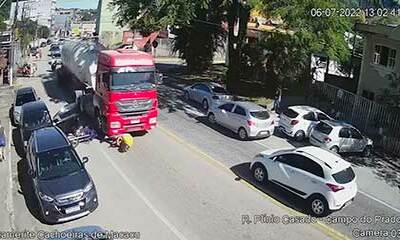 Ce jeudi 7 juillet 2022 à Cachoeiras de Macacu, au Brésil, une conductrice a ouvert sa portière sans regarder et provoquer la chute d'un jeune homme qui roule au guidon de sa moto qui a ensuite glissé sous un camion roul...