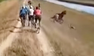 Dans cette vidéo filmée aux États-Unis, un cheval percute une cycliste durant une course de VTT. Sur ces images, le cheval s’énerve, s’emporte et fonce droit en direction du groupe de cycliste pour heurter une femme. Mal...