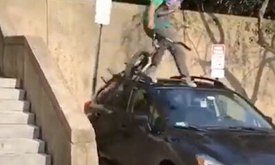 Alors que des jeunes font du BMX dans un escalier pour tenter quelques tricks, l’un se rate et vient tomber sur le toit et pare-brise d’un véhicule. Donc, si jamais vous trouvez votre voiture cabossé dites-vous que ce n’...