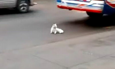 Au Pérou, un chat se jette contre la roue d'un bus qui circule dans une ville. Par chance, des passants avertissent le chauffeur afin qu'il n'avance plus et un piéton vient retirer le chat qui prend alors la fuite en cou...