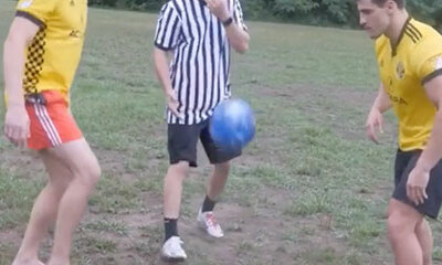 Sur un terrain de football, deux hommes décident de jouer au foot avec une boule de bowling et ce qui n'est pas forcément une bonne idée. C’est alors que l'un d'entre eux va célébrer son but en se suspendant à une cage, ...