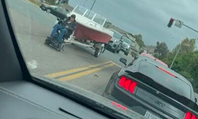 Pourquoi pas ? Dans cette vidéo insolite, un automobiliste filme un homme en fauteuil roulant électrique tracter un bateau sur une route à El Cajon, en Californie. Okay, mais à quel moment il a réalisé que son fauteuil a...