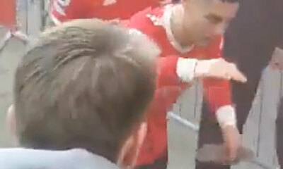 Après la défaite de Manchester United à Everton en Premier League (1-0), Cristiano Ronaldo casse le smartphone d'un supporter en le projetant au sol sur le chemin des vestiaires le 9 avril 2022. Le joueur que l’on appell...