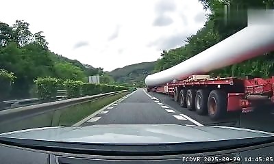 En Chine, sur une autoroute, une voiture équipée d’une dashcam s’est retrouvée coincée par un convoi hors-norme. Le chargement semble être une pièce géante, probablement liée à une éolienne, même si sa forme arrondie int...