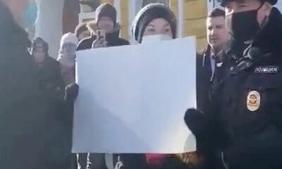 Une image incroyable filmée en Russie ou une femme qui proteste avec un morceau de papier blanc se fait arrêter. A priori, la police l'accuse d'avoir écrit au jus de citron pour faire apparaître aux rayons du soleil un m...