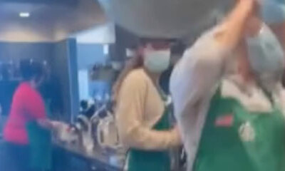 Dans un restaurant Starbucks aux États-Unis, une jeune femme doit vider une poubelle pour ensuite la jeter dans un container. Mais vous allez voir que la poubelle est trop lourde pour la demoiselle qui tente de la soulev...