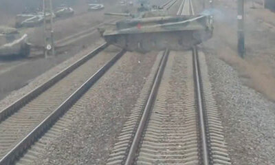 Dans cette vidéo filmée en Ukraine, une colonne de chars russes traverse devant un train en roulant directement sur les voies ferrées près de Novooleksiïvka, une ville de Kherson. Le cheminot du train doit alors s'arrête...