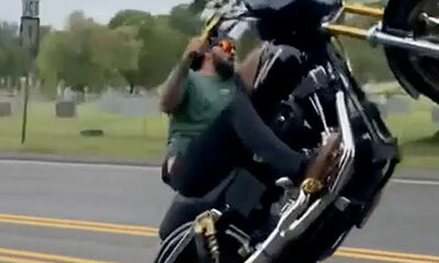 Un motard fait des wheelings en Harley-Davidson