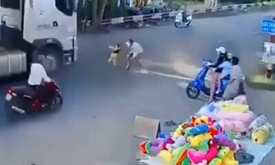 Des images effrayantes filmées en Asie qui aurait pu être dramatique où on peut voir un enfant traverser la route en courant. Problème, c'est route est empruntée par des camions qui roule à vive allure. Par chance le pèr...