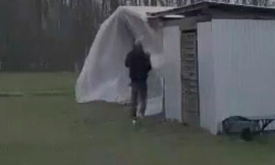 Durant la tempête Eunice, un homme grimpe sur le toit de son cabanon pour le renforcer afin qu'il ne soit par emporté. Problème, une rafale de vent va emporter le toit et l'homme. Par chance, ce dernier n'a pas été bless...