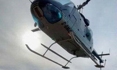 Au sommet d’une colline, un hélicoptère se pose face à un bûcheron sur une plateforme installée sur le versant de la colline à Port Alberni, au Canada. Le but de cette manœuvre assez délicate est de récupérer les bûchero...