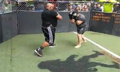 Voilà un petit combat de rue entre deux hommes qui se laisse facilement regarder. D’un coté, nous avons un colosse noir qui enchaine de puissants coups et de l’autre, un homme plus gras qui sait encaisser et attendre le ...