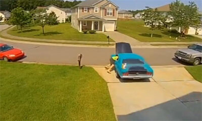 Avec la météo hivernale et le froid, des plaque de verglas peuvent se produite et après être descendu d'une voiture, ce jeune homme tente de ne pas glisser sur une plaque de verglas. Même s'il s'agit probablement d'une m...