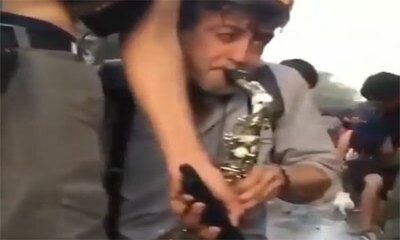 Lors de manifestation assez violente au Chili, un musicien s’est incrusté au milieu des émeutes dans la rue pour mettre un peu d’ambiance. Avec son saxophone, il commence alors par jouer la musique d’un célèbre anime Jap...