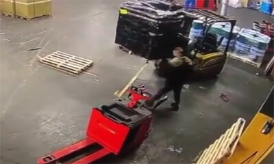 Dans un entrepôt, un cariste qui transporte une palette vient donner des coups de pied dans un morceau de la palette. Mais à force de la frapper, ce dernier se rebelle et le morceau de palette vient frapper le cariste au...