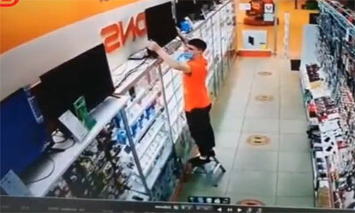 Et non je ne vous balance pas en vous disant que cet homme ne sera pas l'employé de la semaine. Dans une boutique high-tech, un employé décide de déplacer un écran de télévision placé sur une étagère en hauteur. Mais sa ...