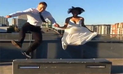 Aux États-Unis un jeune couple de mariés veulent prendre une photo sympathique. Debout sur une marche, ils doivent sauter afin que la photographe réalise des clichés donnant l'impression qu'ils volent. Mais vous allez vo...