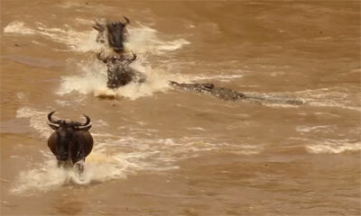 Au cours de la migration annuelle des gnous, un gnou se fait attaquer par un crocodile alors qu'il traverse la rivière Mara dans la réserve nationale du Masai Mara, au Kenya. Sur cette vidéo qui montre la méchanceté de m...