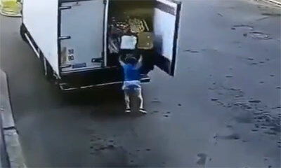 Lors d’une livraison d’une palettes de fruits dans un supermarché, un livreur s’est retrouvé coincé sous des centaines de pommes. Comme le montre la vidéo, le livreur ouvre la porte de la remorque de son camion mais disp...