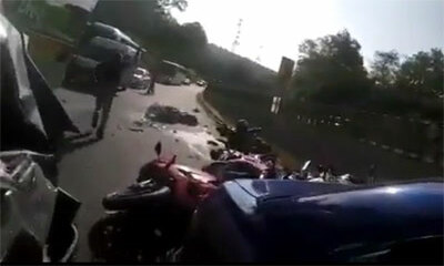 7 morts et 16 blessés durant un énorme carambolage meurtrier survenus ce week-end sur l'autoroute Mexico-Cuernavaca au Mexique. Sur cette vidéo avec l'aide d'une caméra embarquée fixée sur un casque, une femme à moto app...