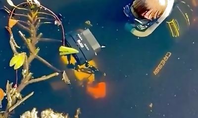 Un cameraman sous-marin filmait de près des plantes aquatiques, probablement pour capter un petit animal accroché dessus. L’homme était concentré sur son objectif quand quelque chose a surgi juste à côté de lui.