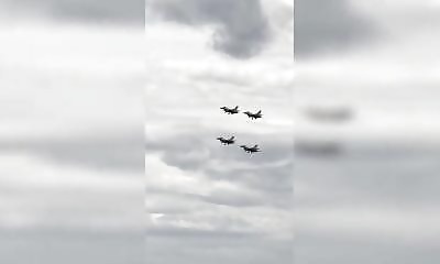 Au-dessus d’une plage, plusieurs chasseurs militaires exécutent une démonstration aérienne. Deux appareils se croisent à grande vitesse, laissant déjà une impression de précision extrême. Un troisième avion s’ajoute, pas...