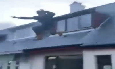 En Angleterre, un home veut sortir de chez lui par le toit et décide de sauter en direction de son jardin. Mais la réception va être très mauvaise et il va carrément venir se péter les deux genoux. On peut entendre le te...