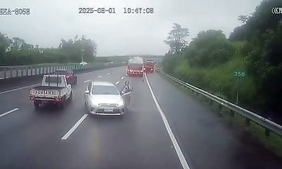 Sur l’autoroute Formosa près de Tainan à Taïwan, une voiture grise a percuté l’arrière d’un poids lourd. Après le choc, la voiture a pivoté et s’est immobilisée en travers de la voie. La conductrice, visiblement en paniq...