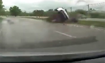 En Asie, la caméra embarquée d’un véhicule filme un impressionnant accident de la route. On peut voir une voiture rouler trop vite glisser sur la chaussée mouillée, partir dans le fossé et décoller dans les airs manquant...