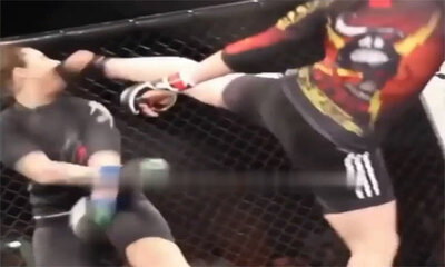 Lors d’un combat en MMA, un coup de pied terrible est venue assommer son adversaire. A gauche de votre écran, la sportive va venir donner un puissant coup de pied au visage (High Kick) pour directement clouer son adversa...