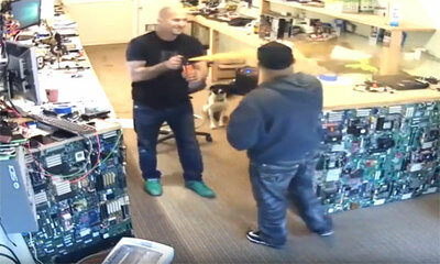 Aux États-Unis, le client magasin d'électronique refuse de payer une réparation pour son ordinateur portable. Le ton monte entre le responsable de la boutique et le client. Ce dernier s'emporte et tente d'arracher l'ordi...