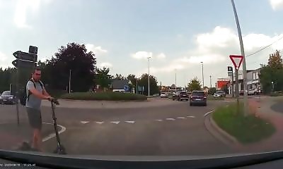 L'automobiliste doit-il laisser passer la trottinette ? Ou doit-elle s'arrêter pour les voitures ? La scène se passe en Belgique ..