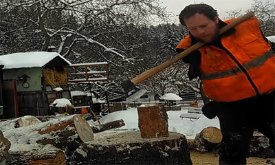 Déjà qu’avec des bras, couper du bois est très physique mais sans bras, la tache doit-être difficile. En République tchèque, un homme sans bras coupe des morceaux de bois avec une hache en plaçant le manche de l'outil so...