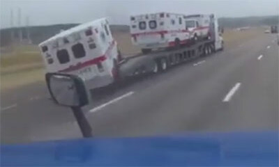 Une caméra embarquée sur le tableau de bord d'un véhicule, filme un camion qui transporte plusieurs ambulances sur sa remorque. Mais apriori, la dernière des ambulances n'est pas correctement attachée sur la remorque. Ce...