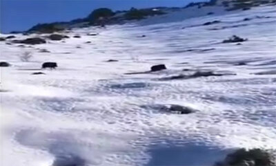 En Corse, plusieurs randonneuses aperçoivent des sangliers sur des pentes enneigées lorsque l'un d'entre eux glisse et tombe dans leur direction. L'animal termine sa gamelle dans un petit cours d'eau juste à coté de mesd...