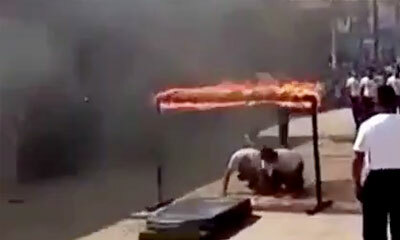 En Arabie saoudite, des voitures font du drift dans des dunes de sable. Mais une des voitures prend feu en grimpant cette montagne de sable. Directement, un conducteur intervient en se rapprochant du véhicule pour venir ...